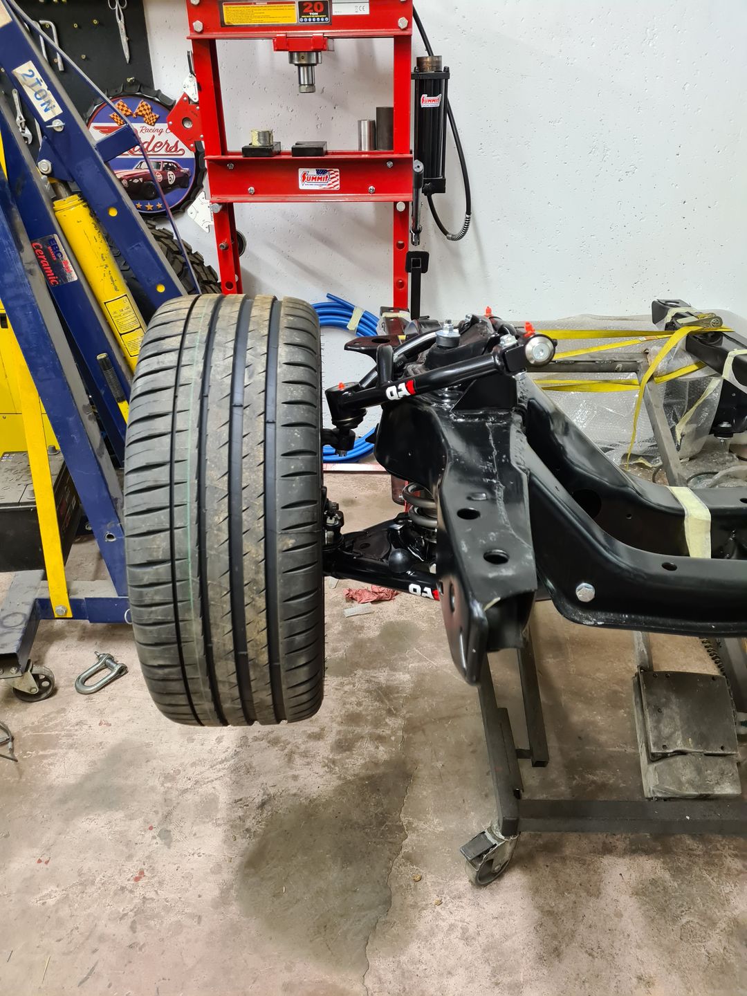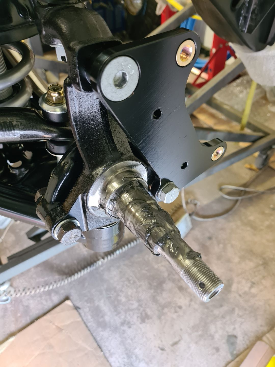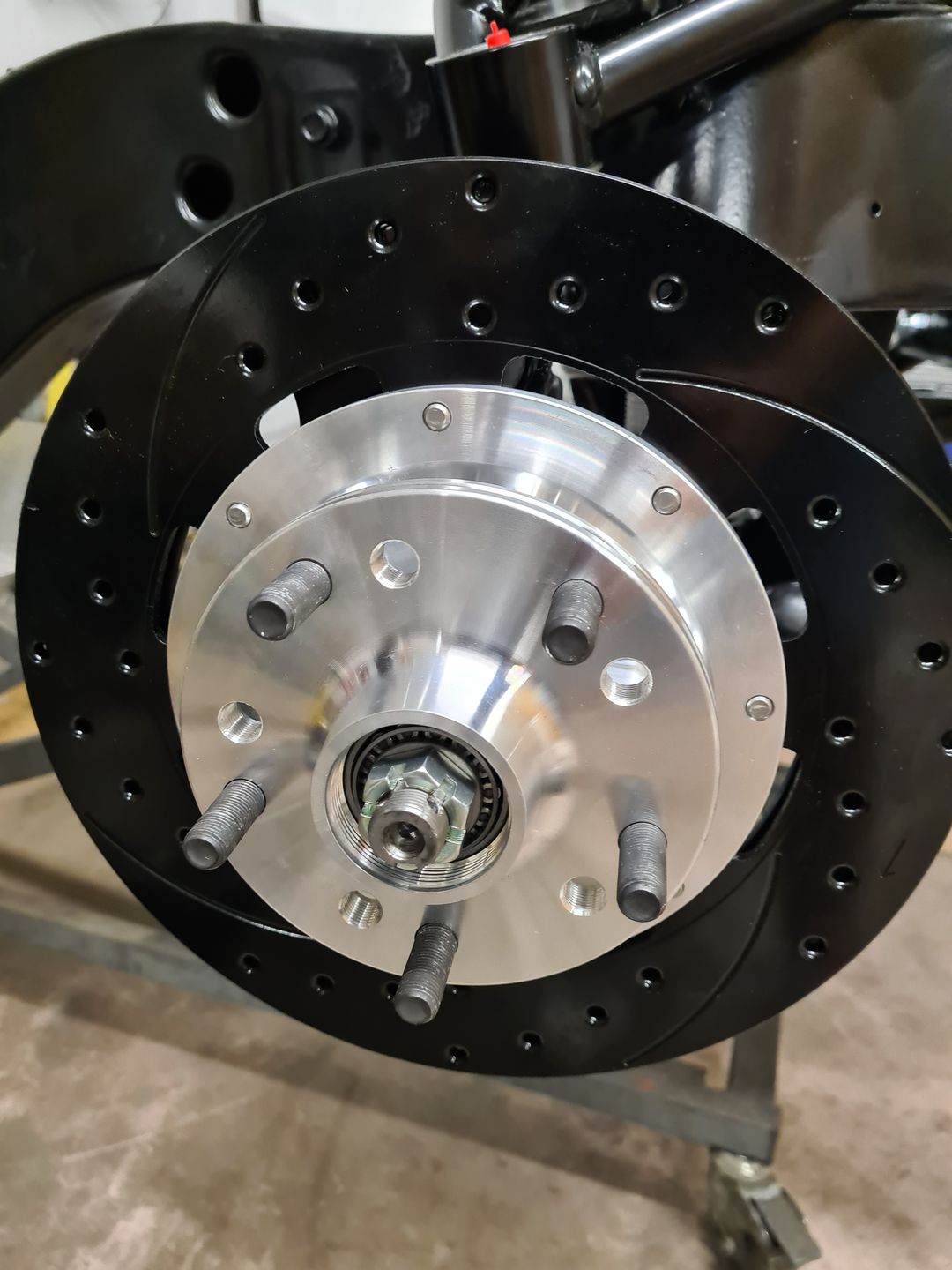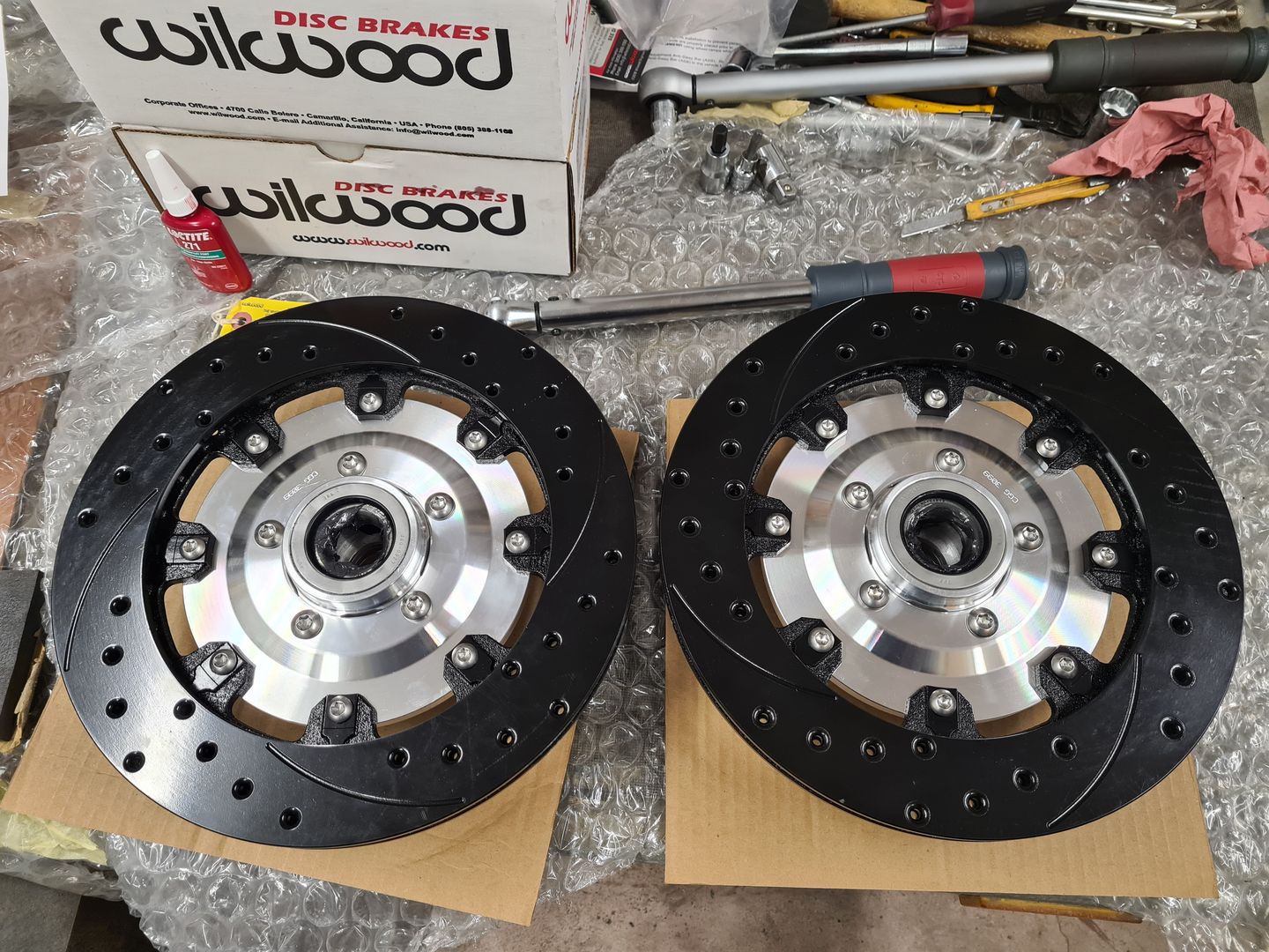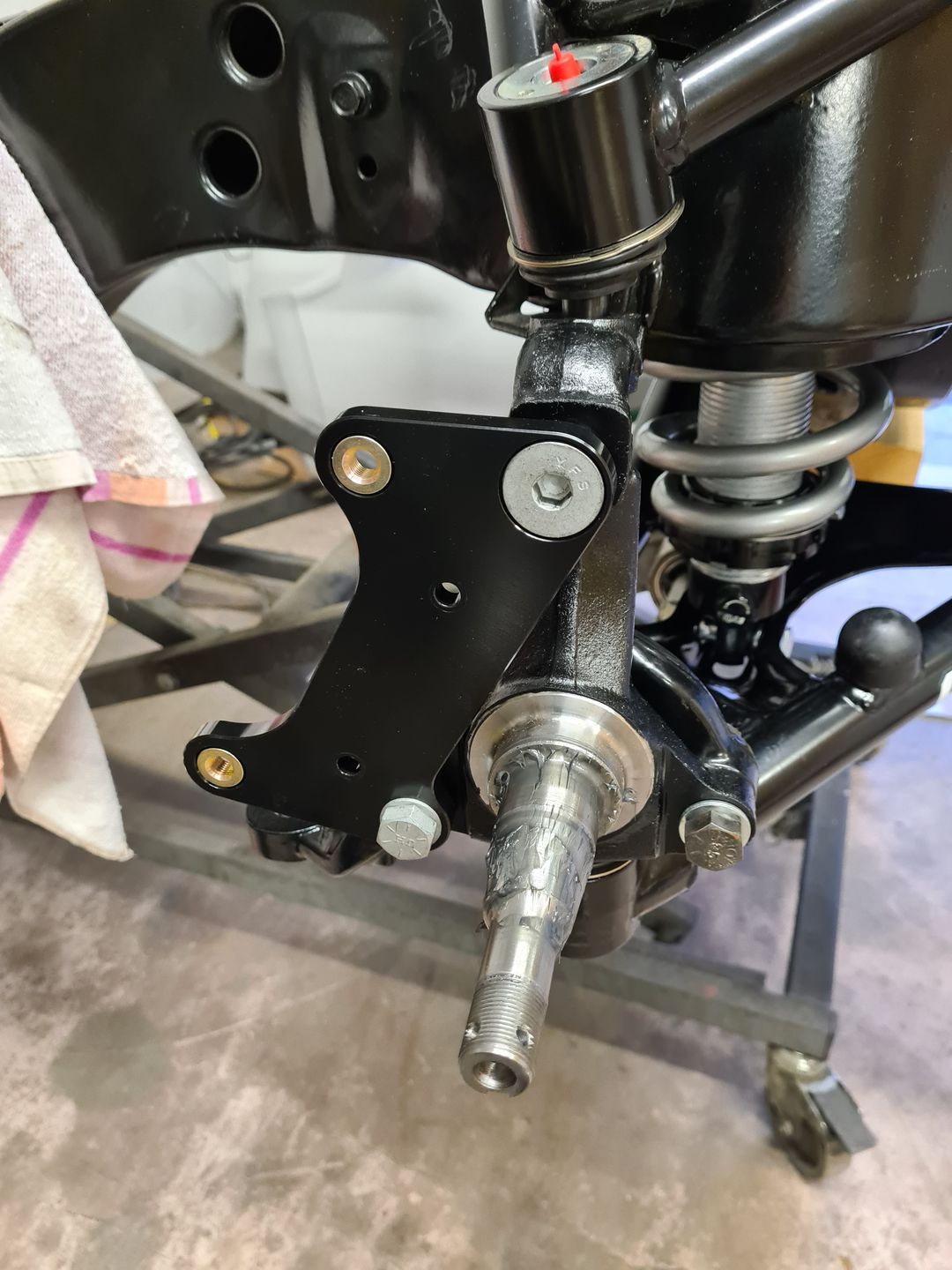 Ci-dessous l’installation du kit disque Wilwood 6 pistons à l’avant et combiné QA1 réglable en compression. Je ne vous cache pas que c’est vraiment agréable de monter du beau matos comme celui-là et neuf, que du bonheur! L’installation est sans grande difficulté sauf peut-être pour compresser les combinés afin de raccorder le bras supérieur à la fusée de roue mais avec un peu de patience et de système « D » on y arrive. Pour le reste il faut suivre soigneusement les instructions et serrage de couple.