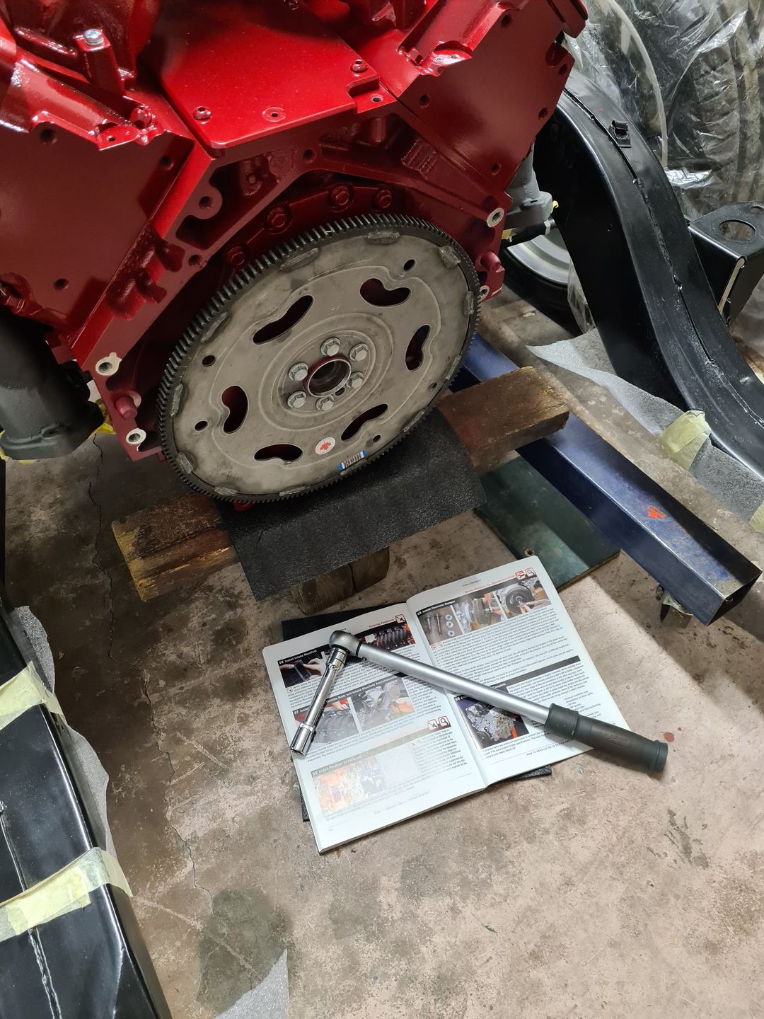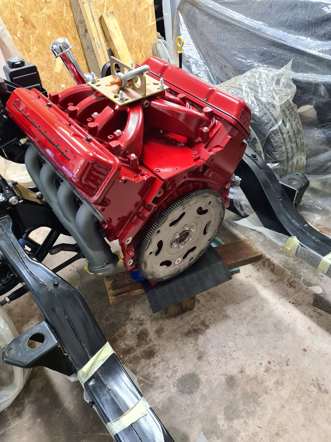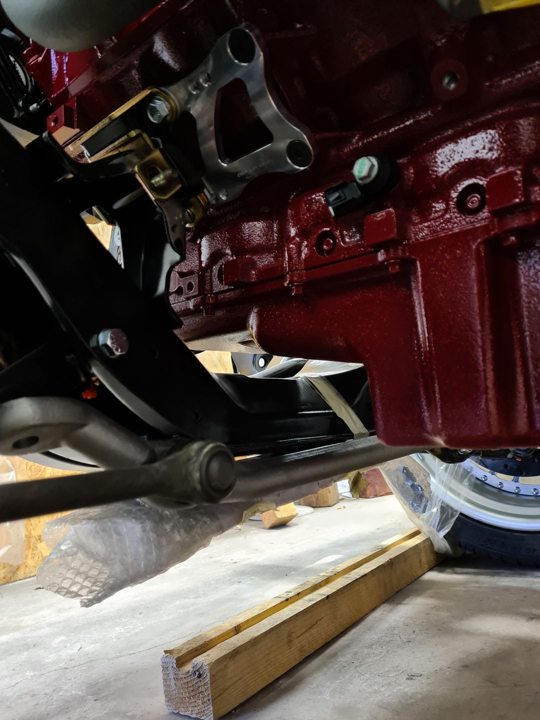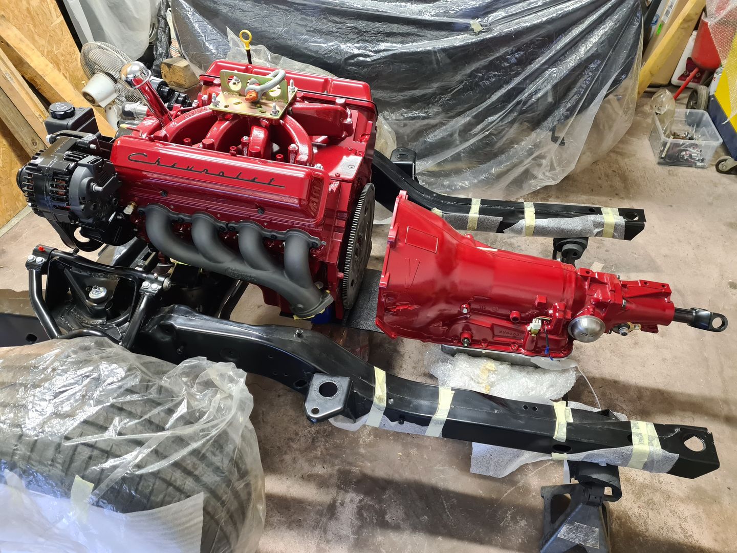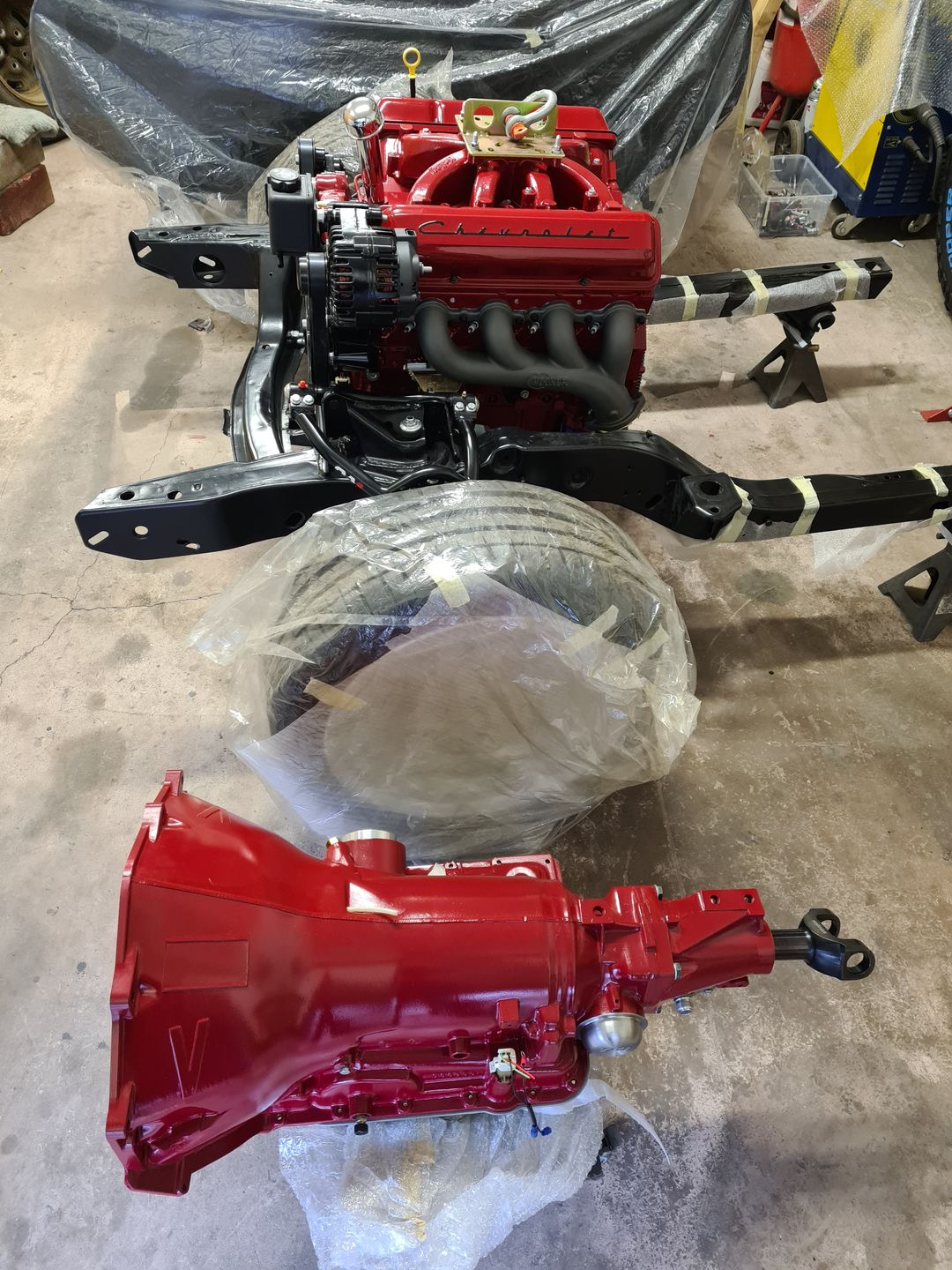 La suite justement c’est l’installation de la boite de vitesse 700r4 (ou 4L60 comme vous voulez), afin de là encore voir si tout passe sans encombre puis de créer son support. Dans un premier temps on installera sans le convertisseur de couple et une fois le support de boite fait et que le montage à blanc est validé, à ce moment là on passera au montage final. Je vous laisse voir les photos, perso je trouve ça trop beau et je visualise déjà toute la face avant montée et le reste, arrrfff trop hâte mais patience!!