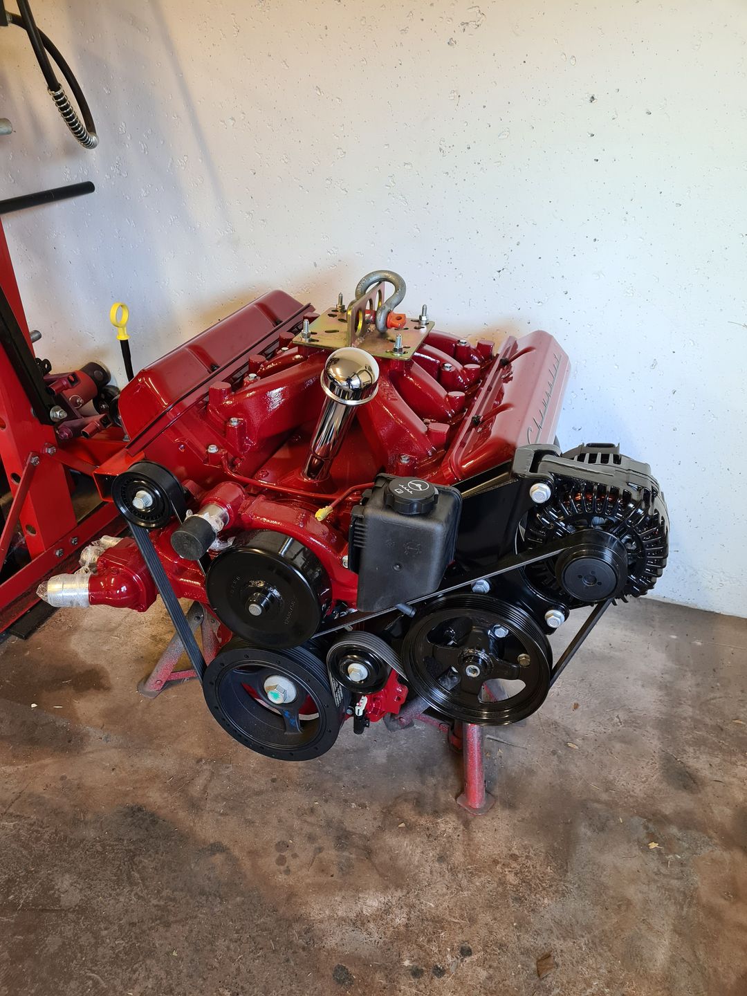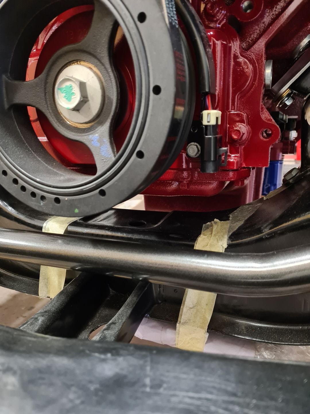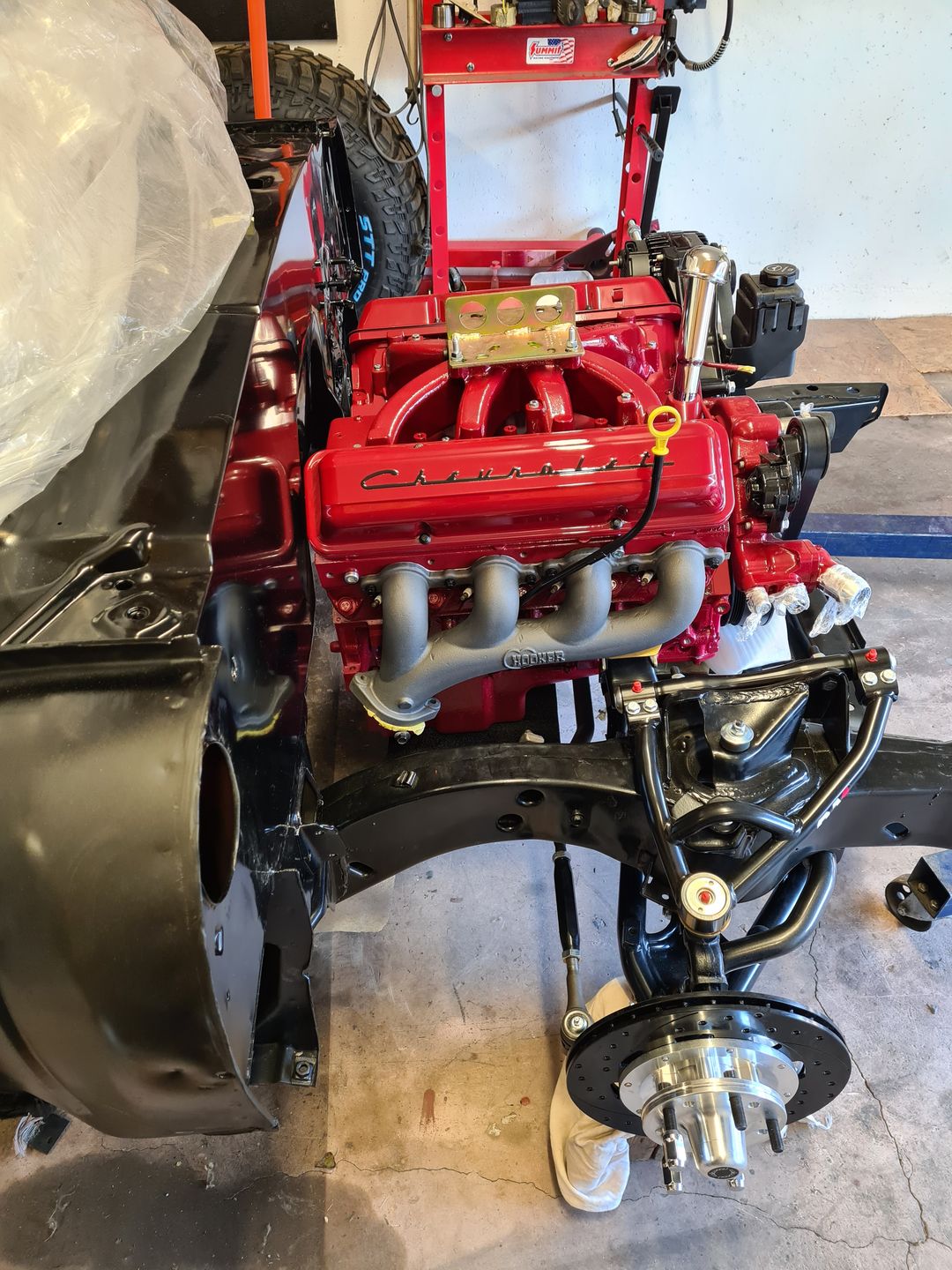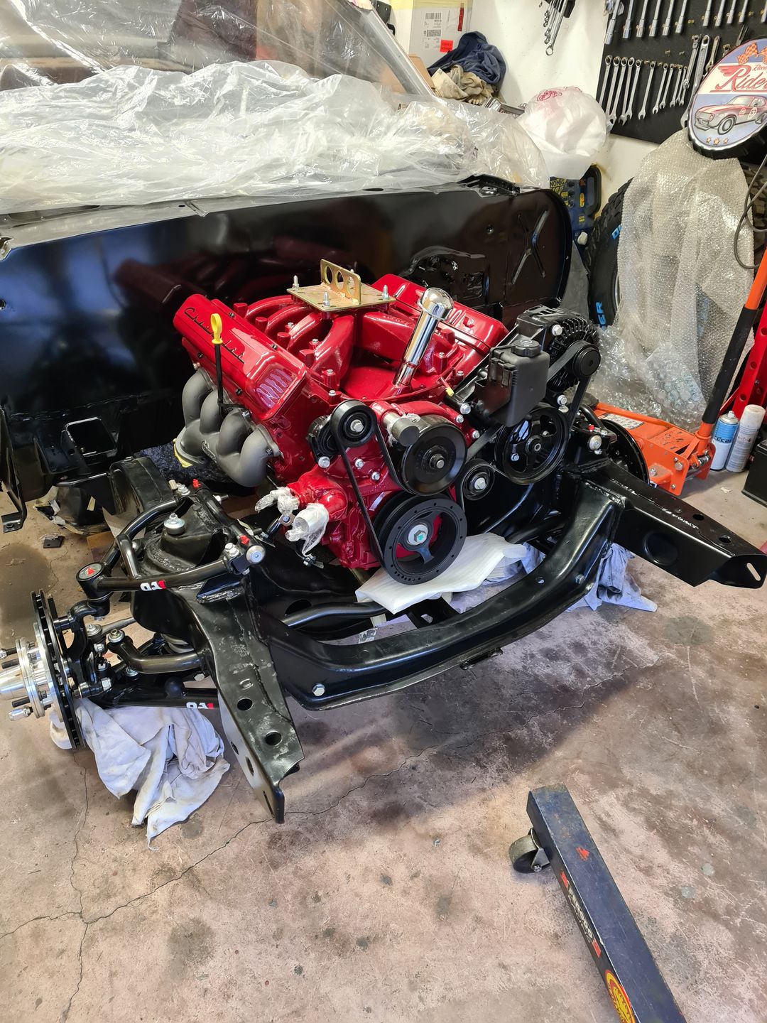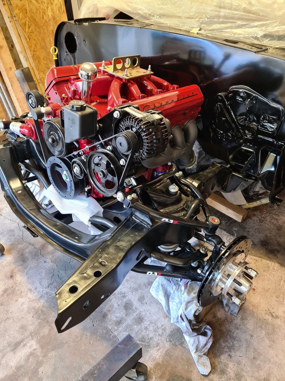 La suite justement c’est l’installation de la boite de vitesse 700r4 (ou 4L60 comme vous voulez), afin de là encore voir si tout passe sans encombre puis de créer son support. Dans un premier temps on installera sans le convertisseur de couple et une fois le support de boite fait et que le montage à blanc est validé, à ce moment là on passera au montage final. Je vous laisse voir les photos, perso je trouve ça trop beau et je visualise déjà toute la face avant montée et le reste, arrrfff trop hâte mais patience!!