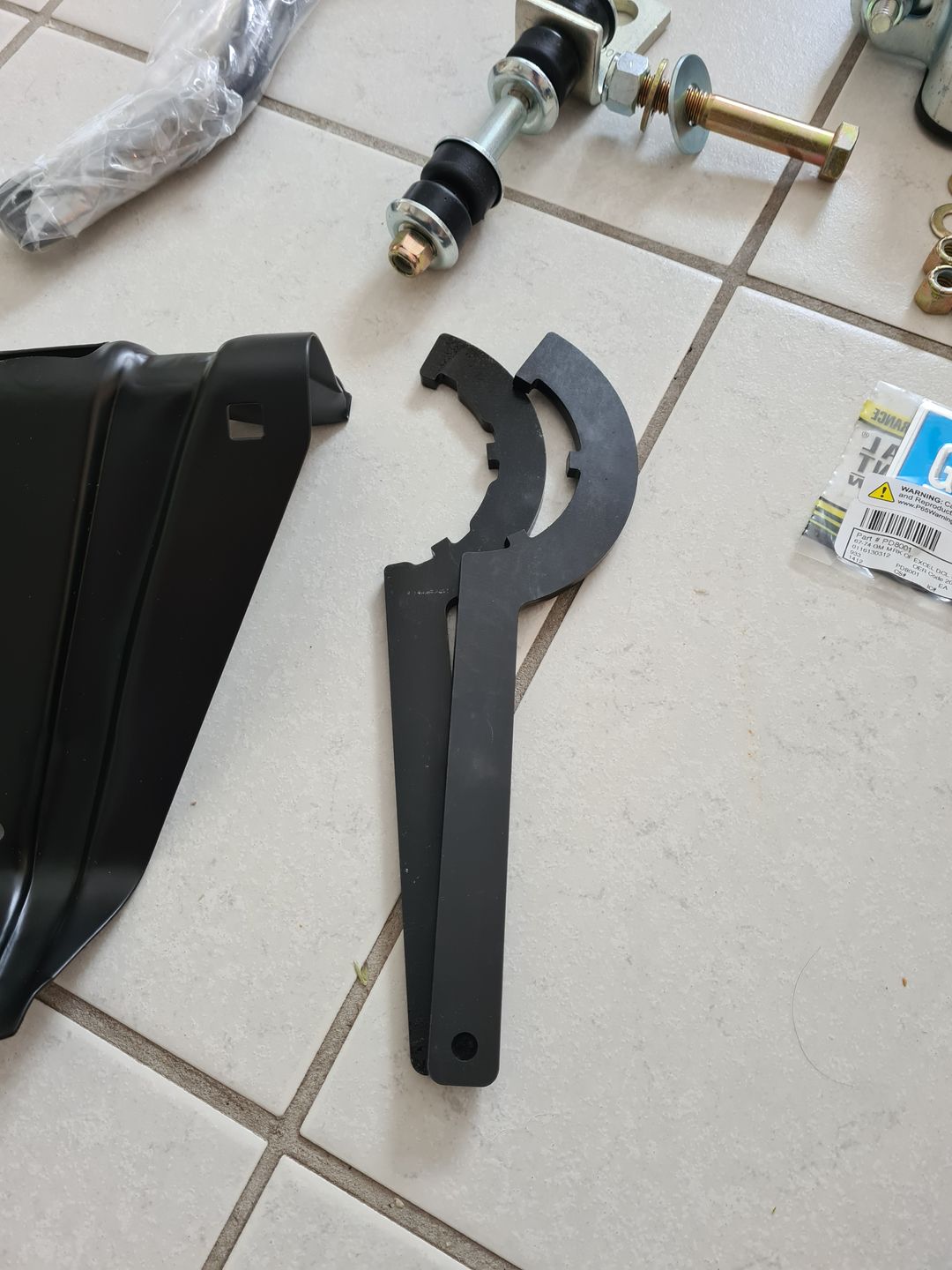 Pour le reste il s’agit des clés pour compresser les ressorts avant du kit QA1, du support de plaque avant, ou encore d’un « fender gripper » pour s’appuyer sur la caisse au niveau du compartiment moteur.