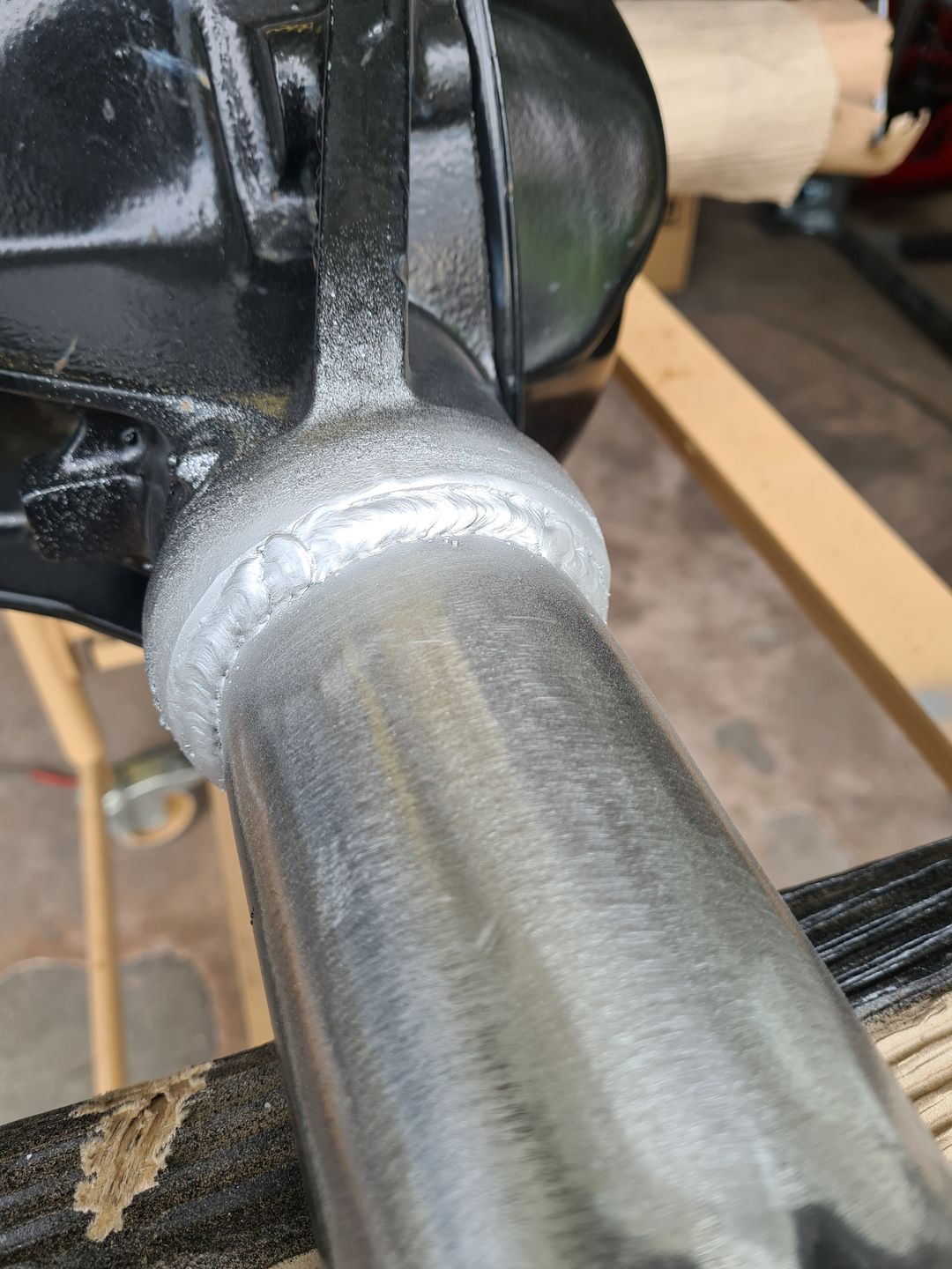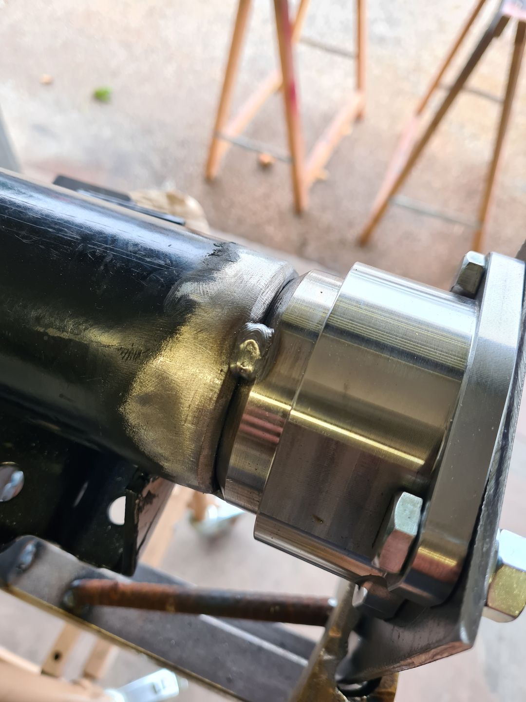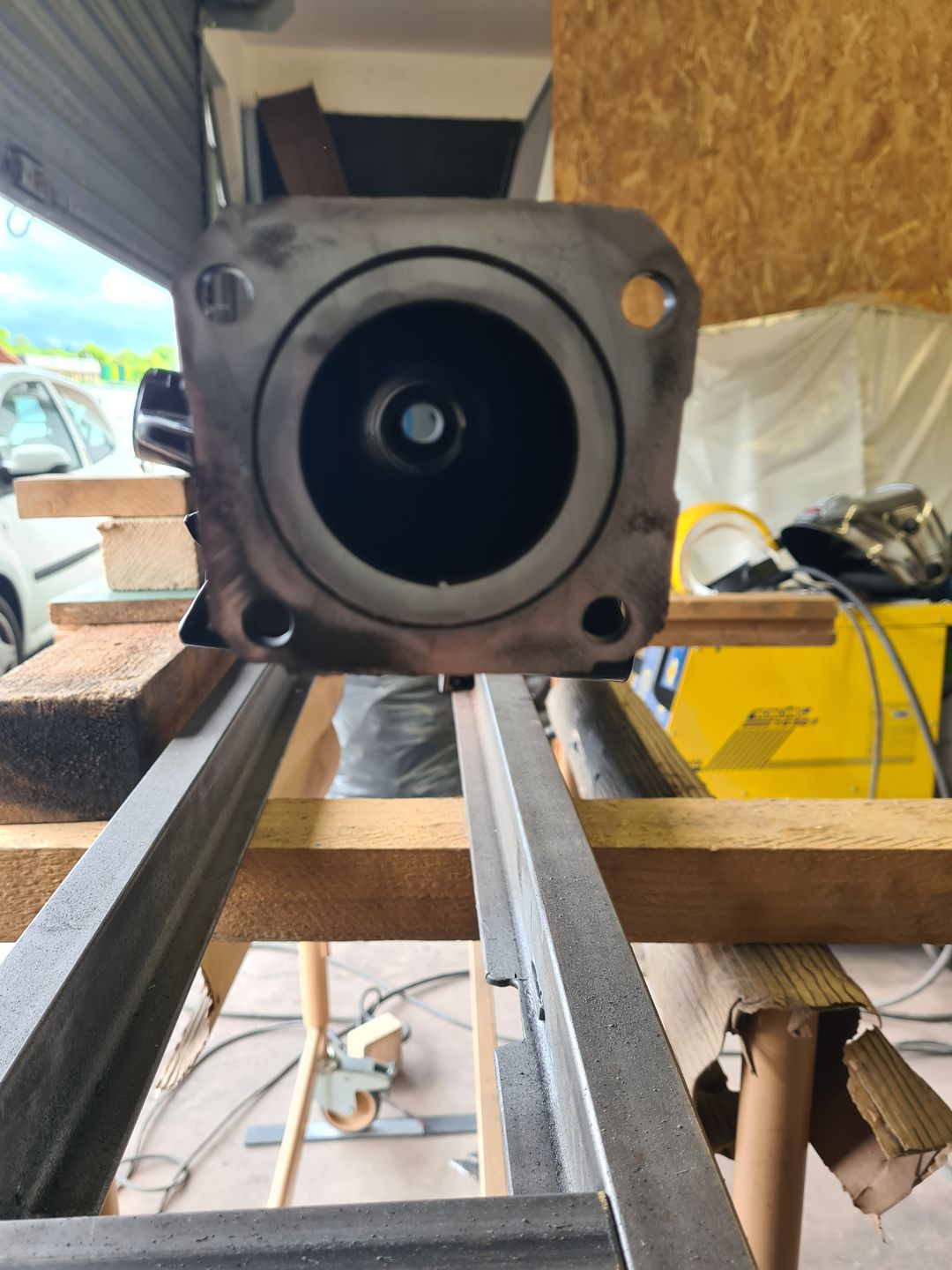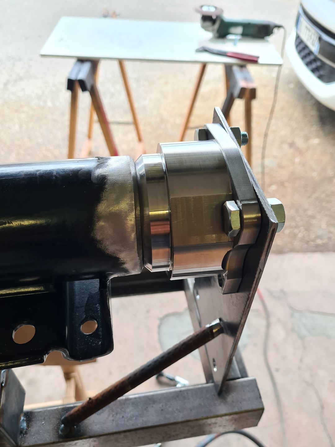 Une fois le nouveau support de roulement positionné on contrôle que tout est bien aligné et on pointe puis on soude le tout et c’est terminé. Si vous ne vous sentez pas de souder ces pièces ou vous n’avez pas confiance en vos soudures, je ne peux que vous conseiller de nouveau de faire appel à un pro!