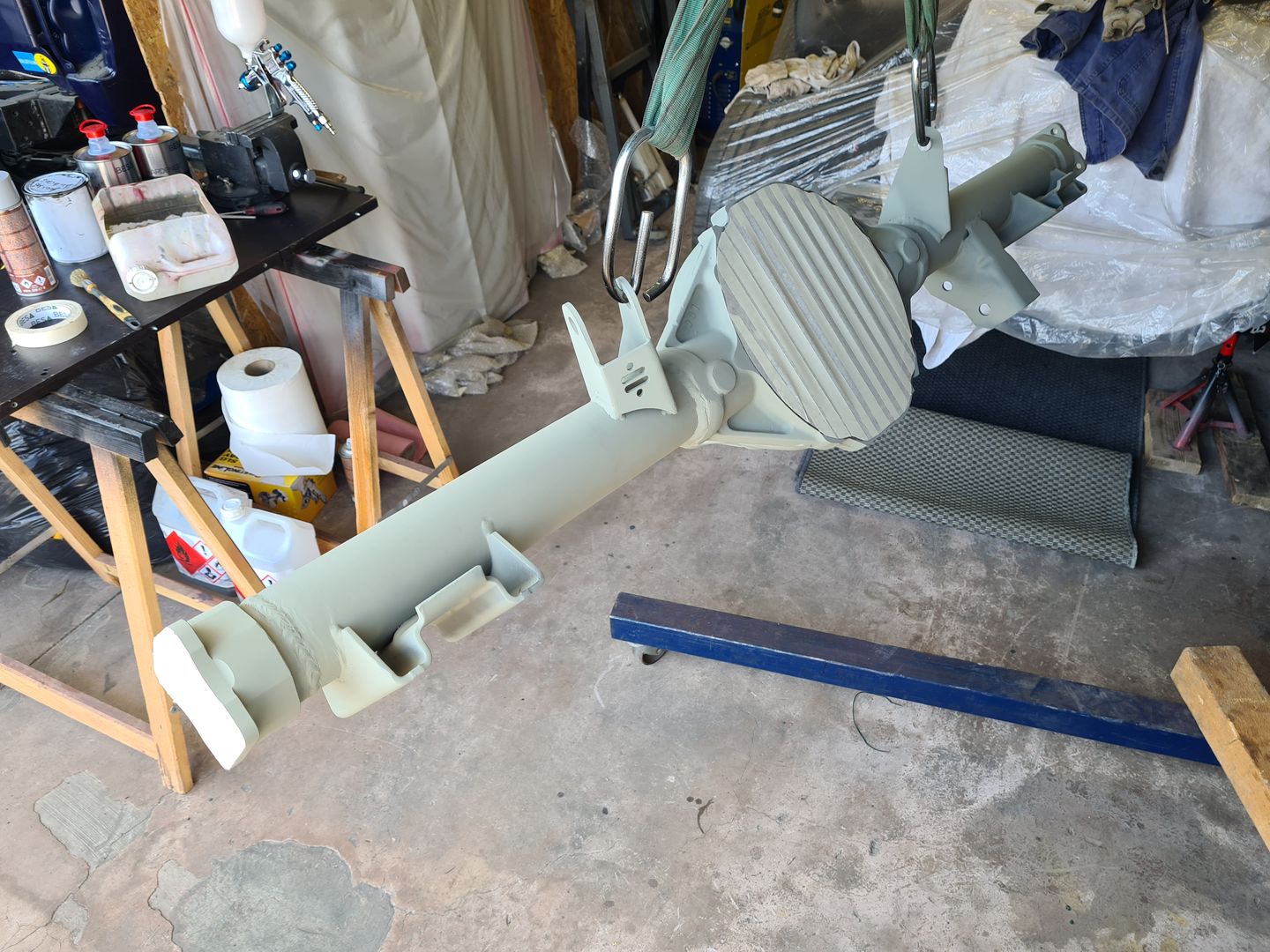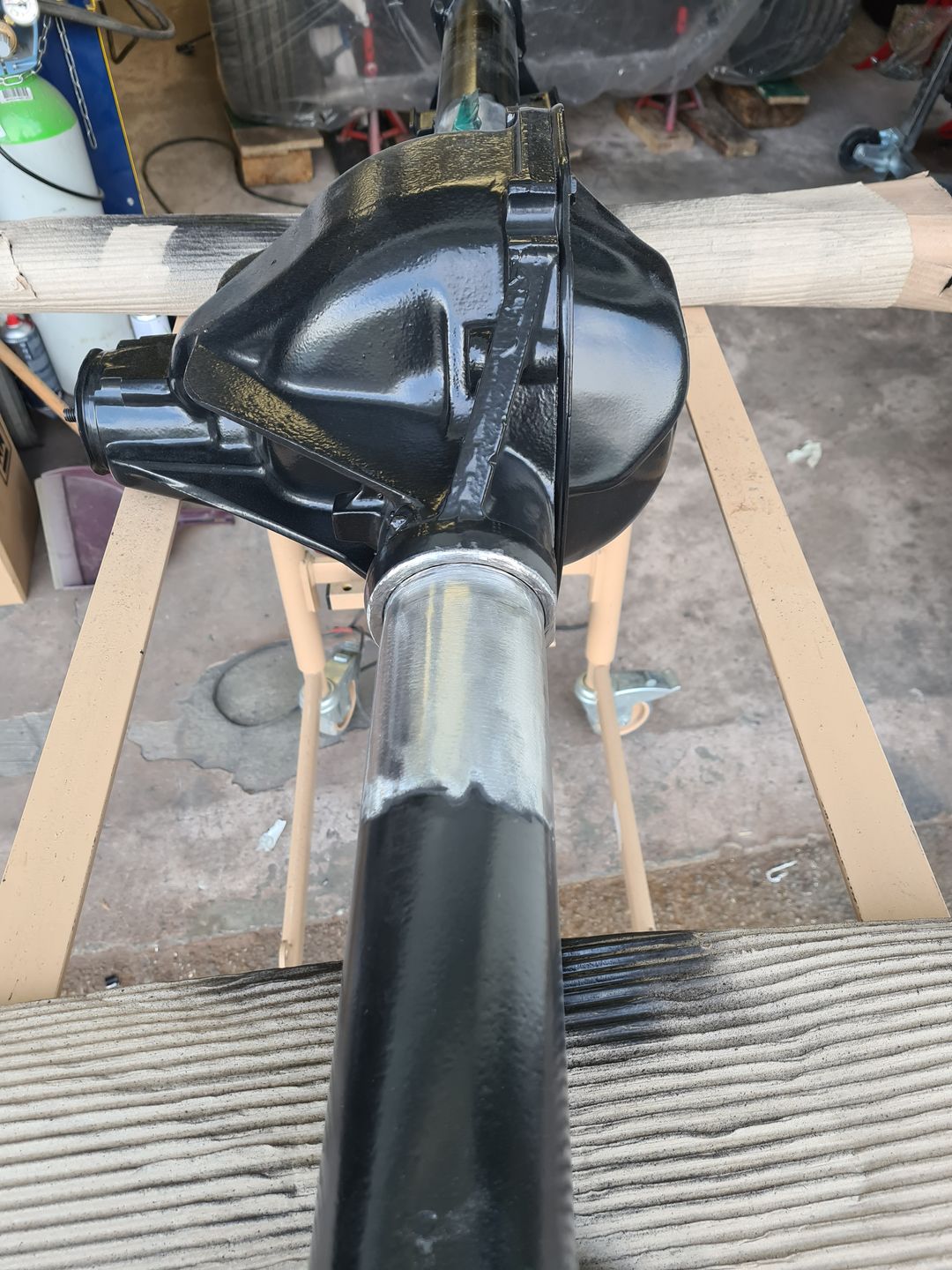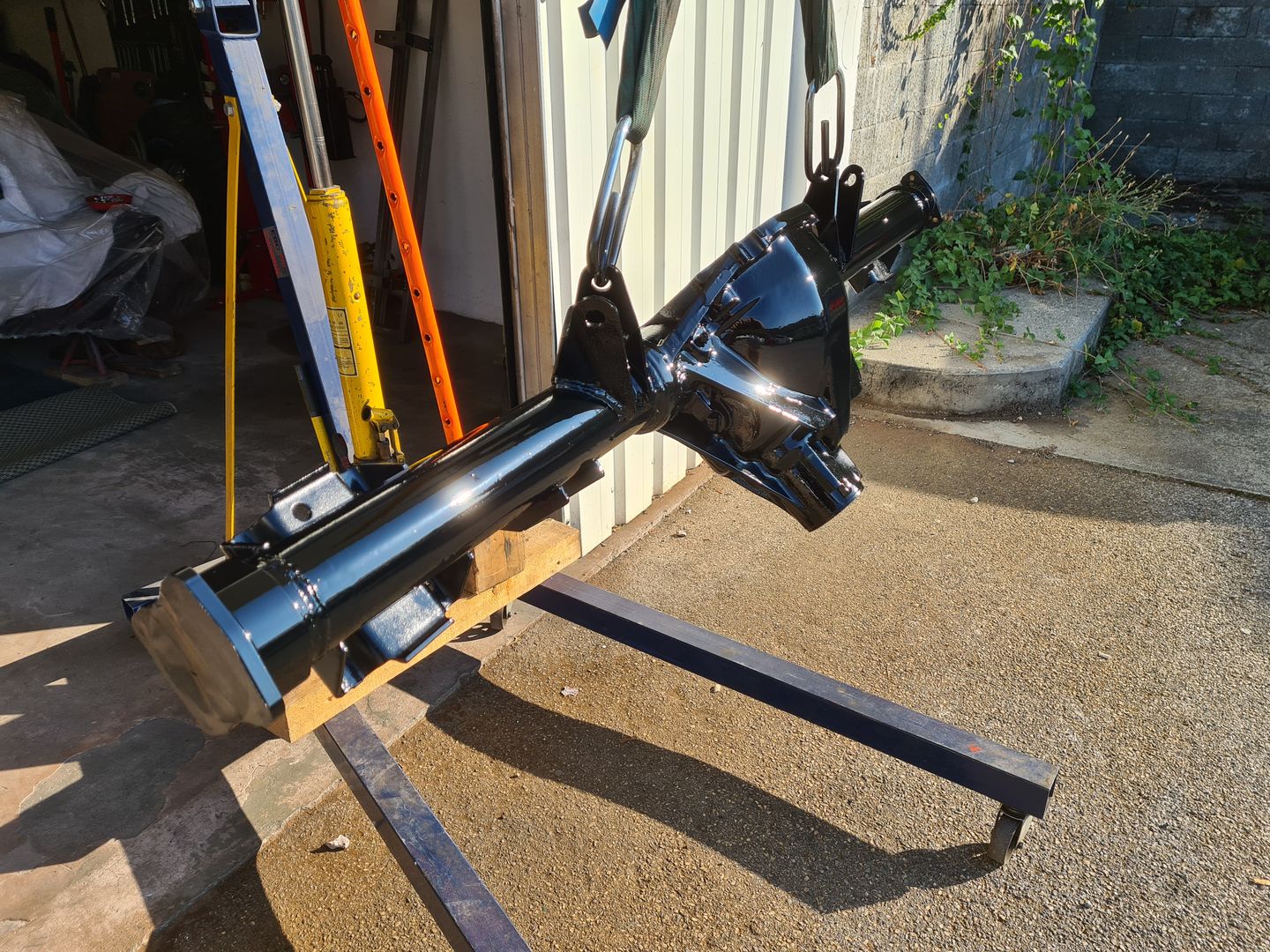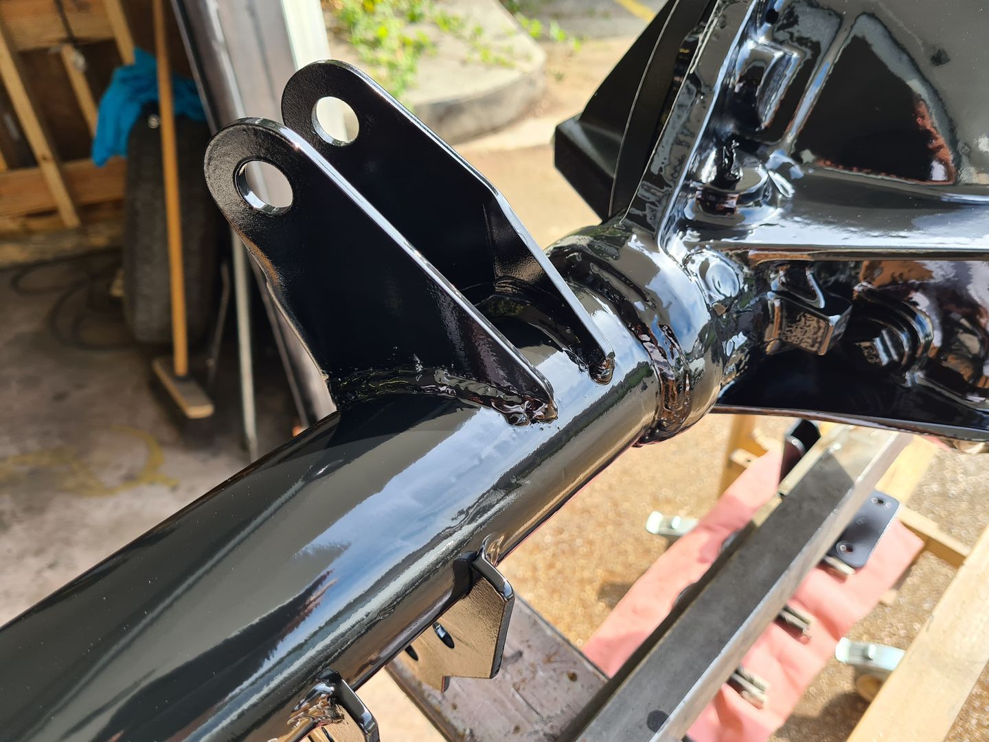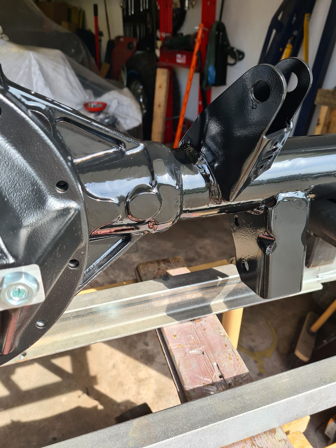 Enfin ci-dessous la mise en peinture qui ne sert ici qu’à donner la couleur car je rappelle que le pont avait été grenaillé et métallisé donc fini la rouille. A noter que j’ai mis deux couches mais pour tout vous dire une seule aurait suffit sauf que je trouvais le noir satiné trop brillant, j’ai donc été voir mon fournisseur en lui disant que je voulais un satin moins brillant et résultat il me redonne un autre pot de RAL9005 qui au final…. me donne le même rendu! Bref, je ne vais pas insister ça ira très bien comme cela car je ne trouverai pas ce que je veux comme teinte de noir satiné et je ne vais pas perdre plus de temps ici.