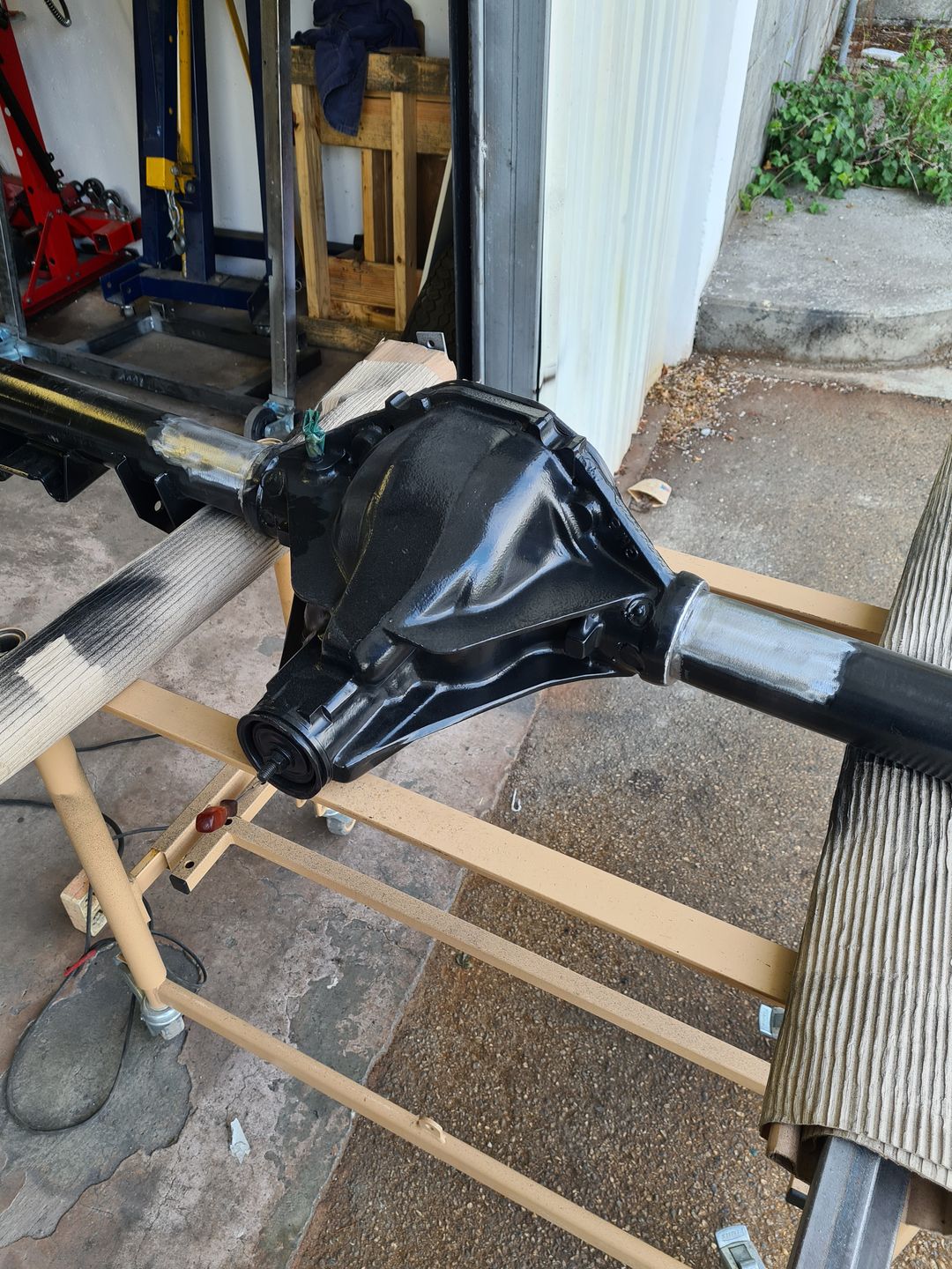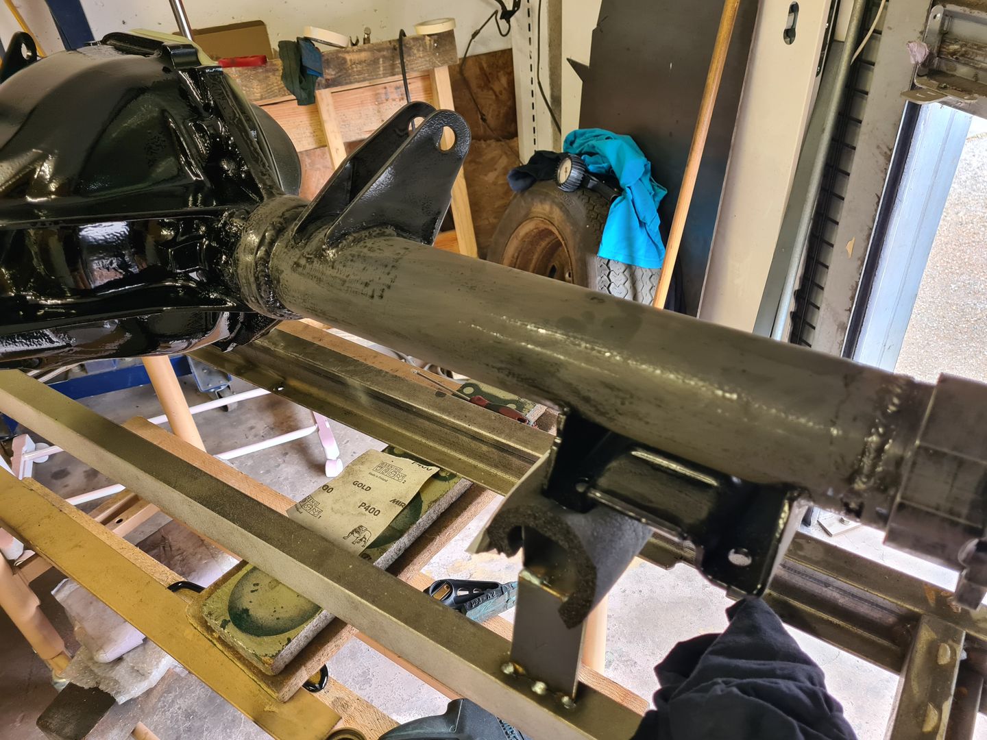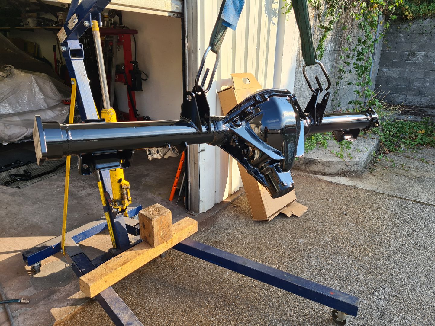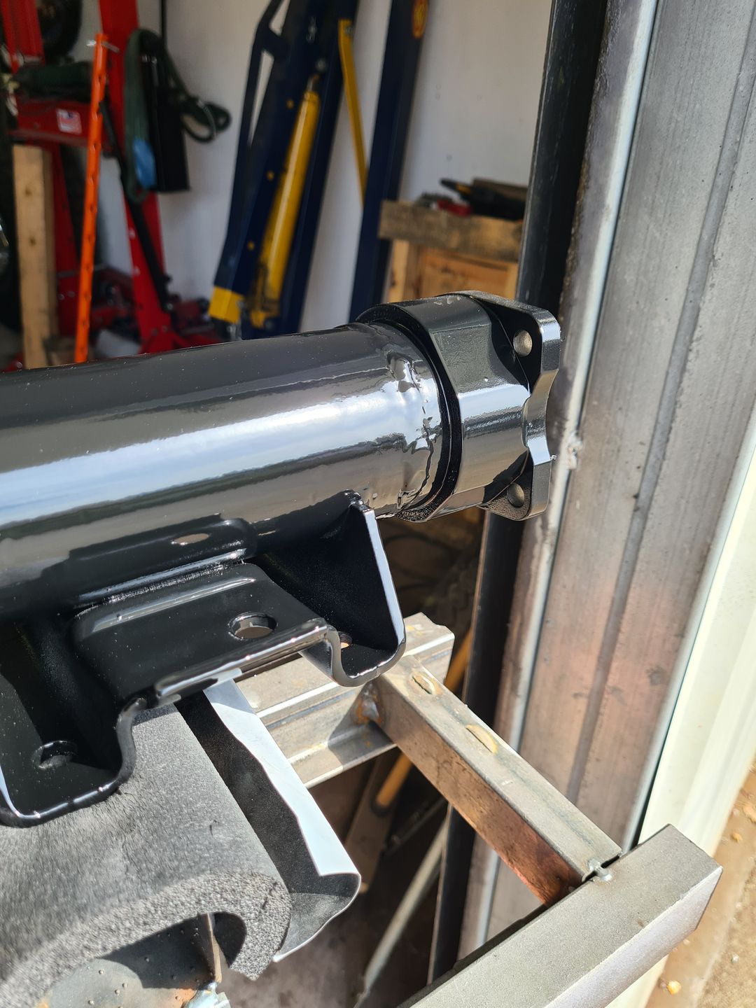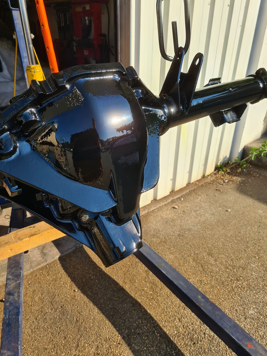 Enfin ci-dessous la mise en peinture qui ne sert ici qu’à donner la couleur car je rappelle que le pont avait été grenaillé et métallisé donc fini la rouille. A noter que j’ai mis deux couches mais pour tout vous dire une seule aurait suffit sauf que je trouvais le noir satiné trop brillant, j’ai donc été voir mon fournisseur en lui disant que je voulais un satin moins brillant et résultat il me redonne un autre pot de RAL9005 qui au final…. me donne le même rendu! Bref, je ne vais pas insister ça ira très bien comme cela car je ne trouverai pas ce que je veux comme teinte de noir satiné et je ne vais pas perdre plus de temps ici.
