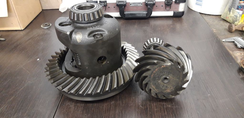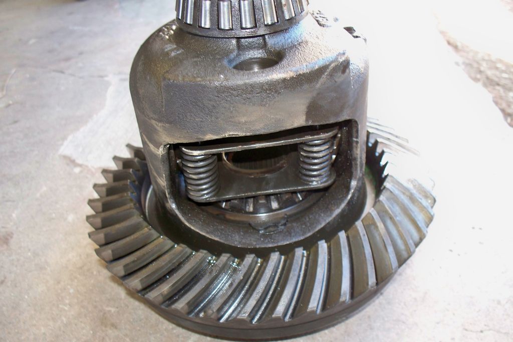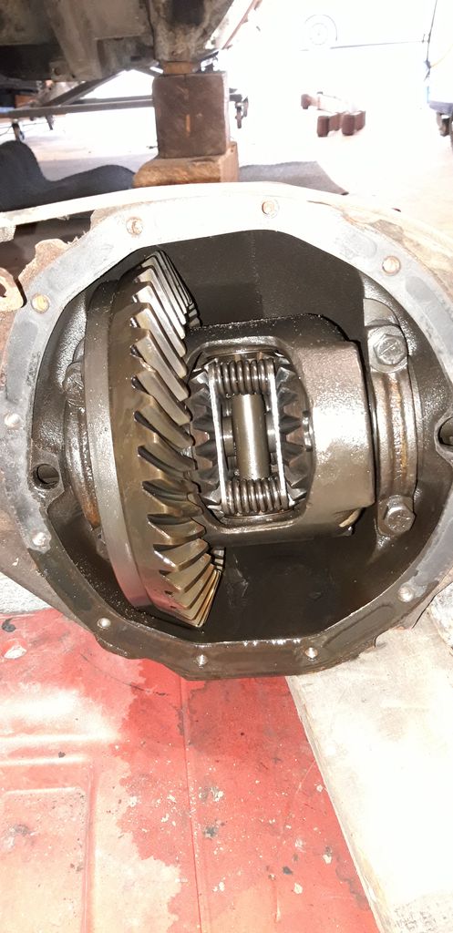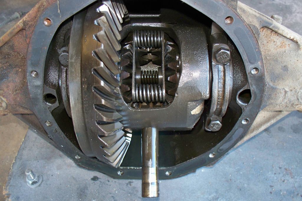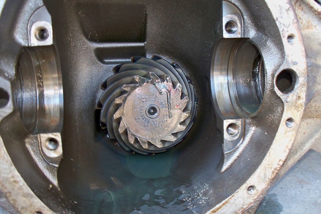 Une fois les arbres retirés, on peut démonter l’ensemble différentiel/couronne en faisant bien attention de tout repérer pour remonter ensuite les mêmes pièces au même endroit, c’est très important pour la survie du pont. Une fois le différentiel sorti, j’ai constaté qu’il manquait le bout d’une dent sur la couronne mais c’est à l’extérieur donc rien qui empêcherai un remontage, sauf que moi je ne vais pas remonter ce couple conique car trop long. En effet, 2.73:1 c’est un rapport long et prévu pour économiser du carburant et obtenir un régime moteur bas sur autoroute. Comme je ne vais pas beaucoup rouler et que j’habite dans une région montagneuse, je vais trouver un juste milieu entre performance et économie et passer avec un rapport de 3.42:1. Je vous expliquerai plus loin, mais on pourrait croire que racheter des couples coniques pour un 12 boulons est un jeu d’enfant, oui mais non, GM n’a pas fait simple sur ce coup-là et je vais devoir également racheter un nouveau différentiel car il en existe de trois sortes.