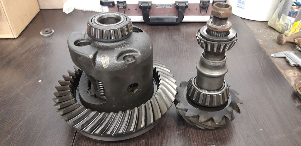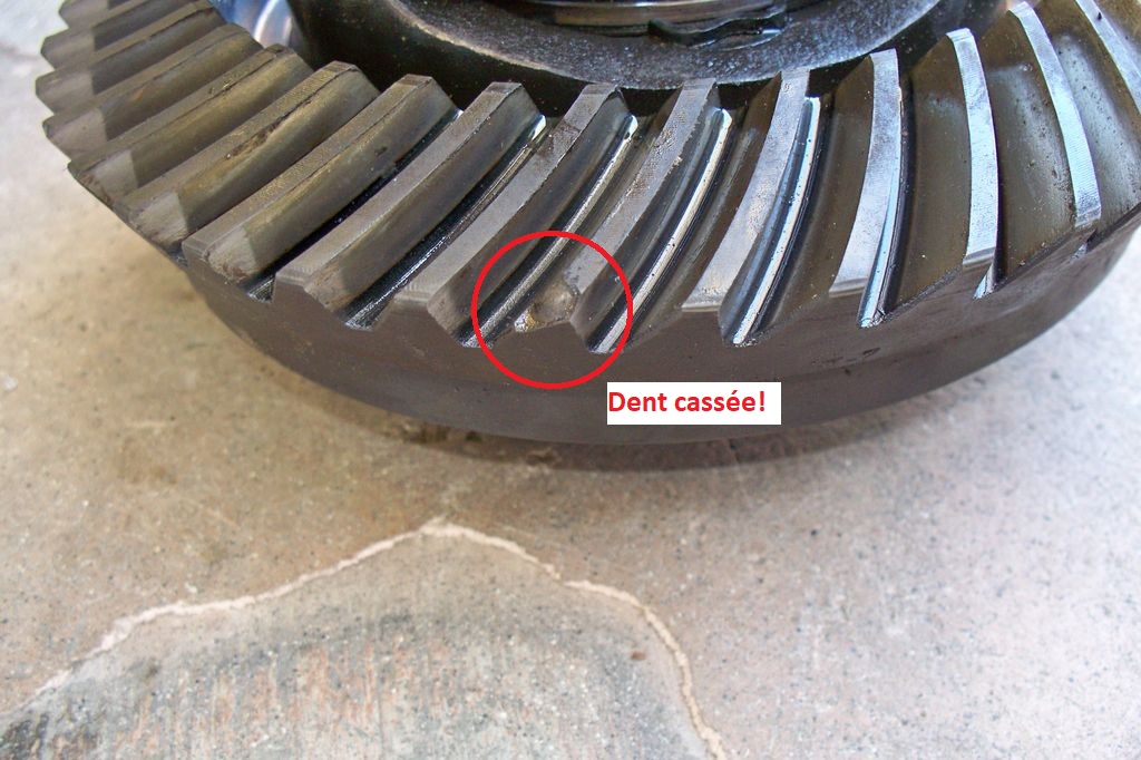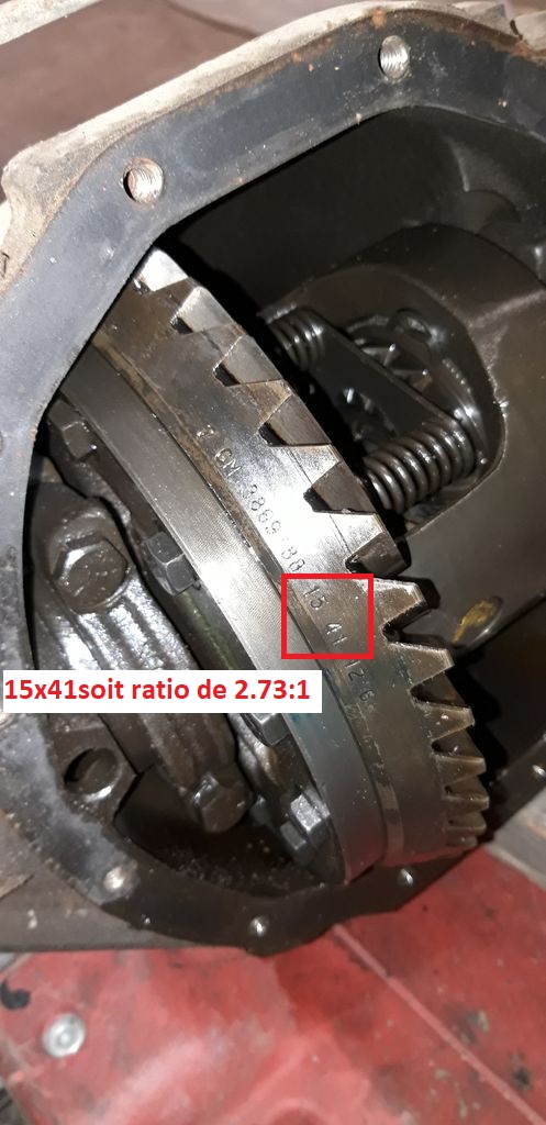 On commence par retirer le couvercle du différentiel et rapidement on regarde si tout est en bon état. Dans mon cas le pont avait déjà été ouvert mais non démonté et il est en bon état, j’ai tout de même récupéré un petit morceau d’une dent de la couronne… aie. On voit aussi inscrit sur la couronne « 15 41 » et on compte bien une couronne de 41 dents et un pignon de 15 dents soit 41/15=2.73